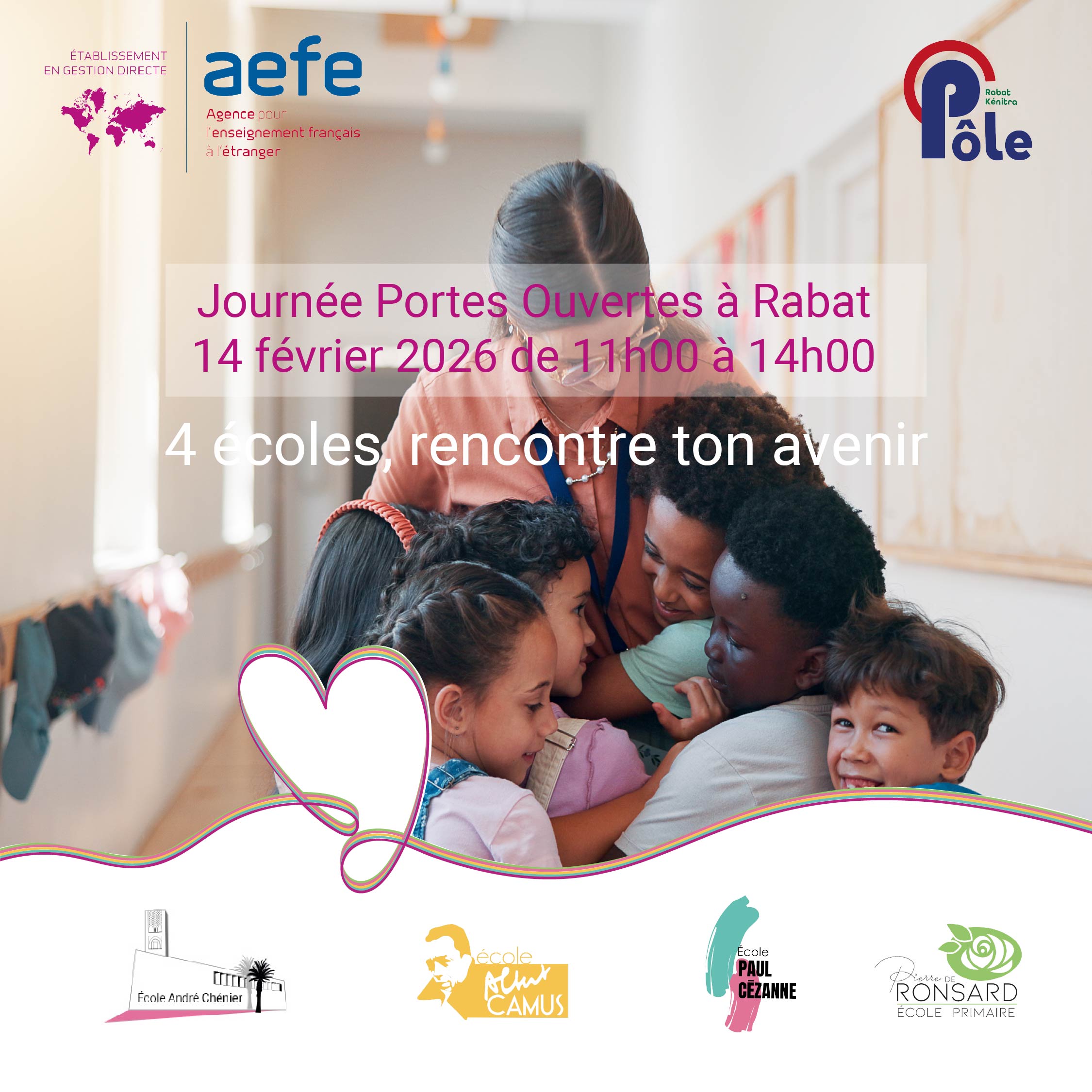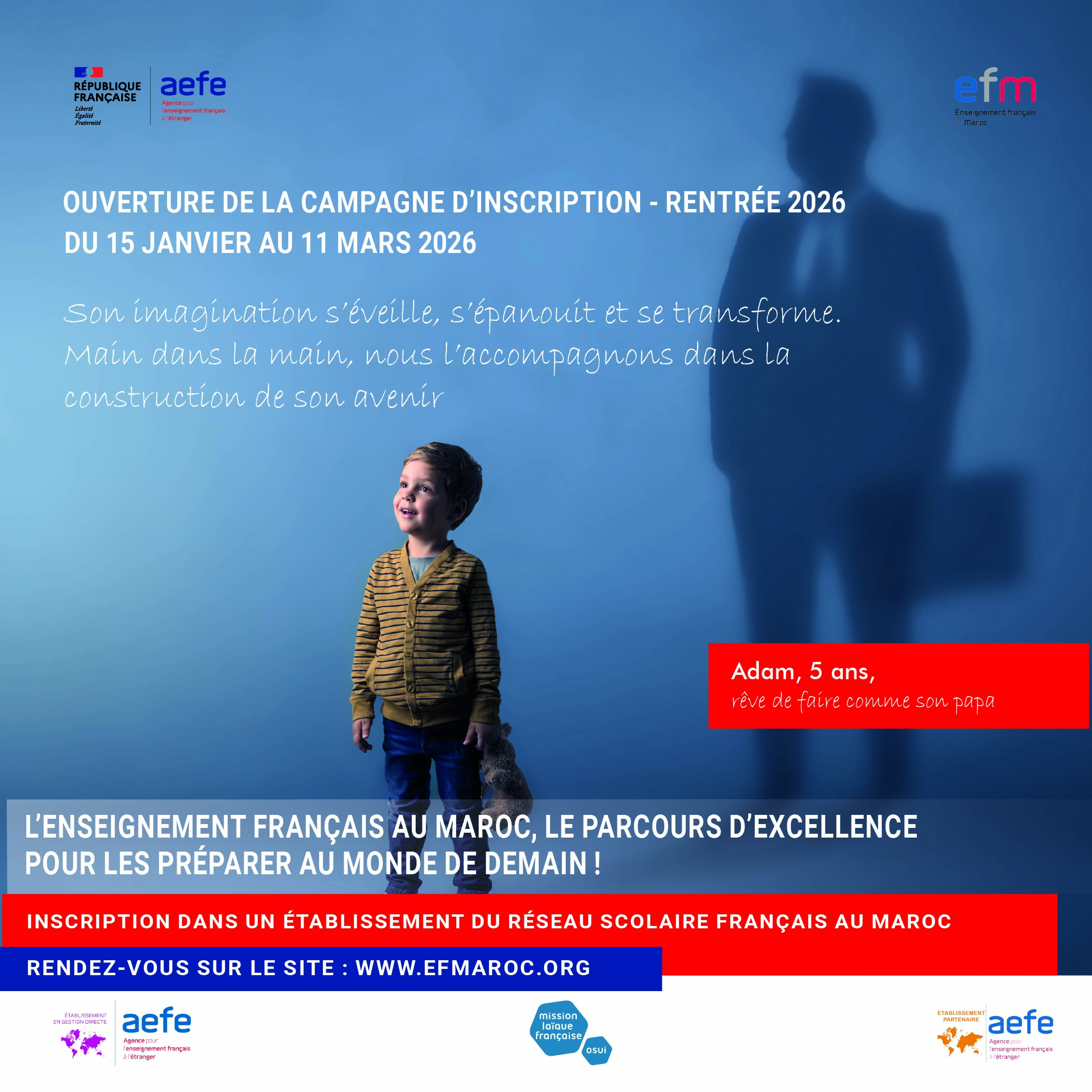Madame, Monsieur, Chères familles, Du 05 janvier au 11 mars 2026, les inscriptions pour la rentrée 2026 sont ouvertes dans l’ensemble du réseau des établissements scolaires français au Maroc. Toutes les informations et les modalités d’inscription sont disponibles sur le …