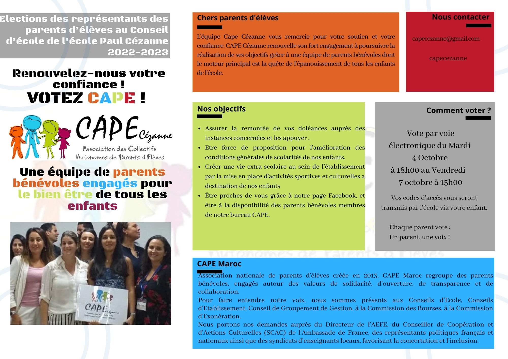 Trois Associations de Parents d’Élèves sont représentées à l’école Paul Cézanne. Je leur souhaite bonne chance.